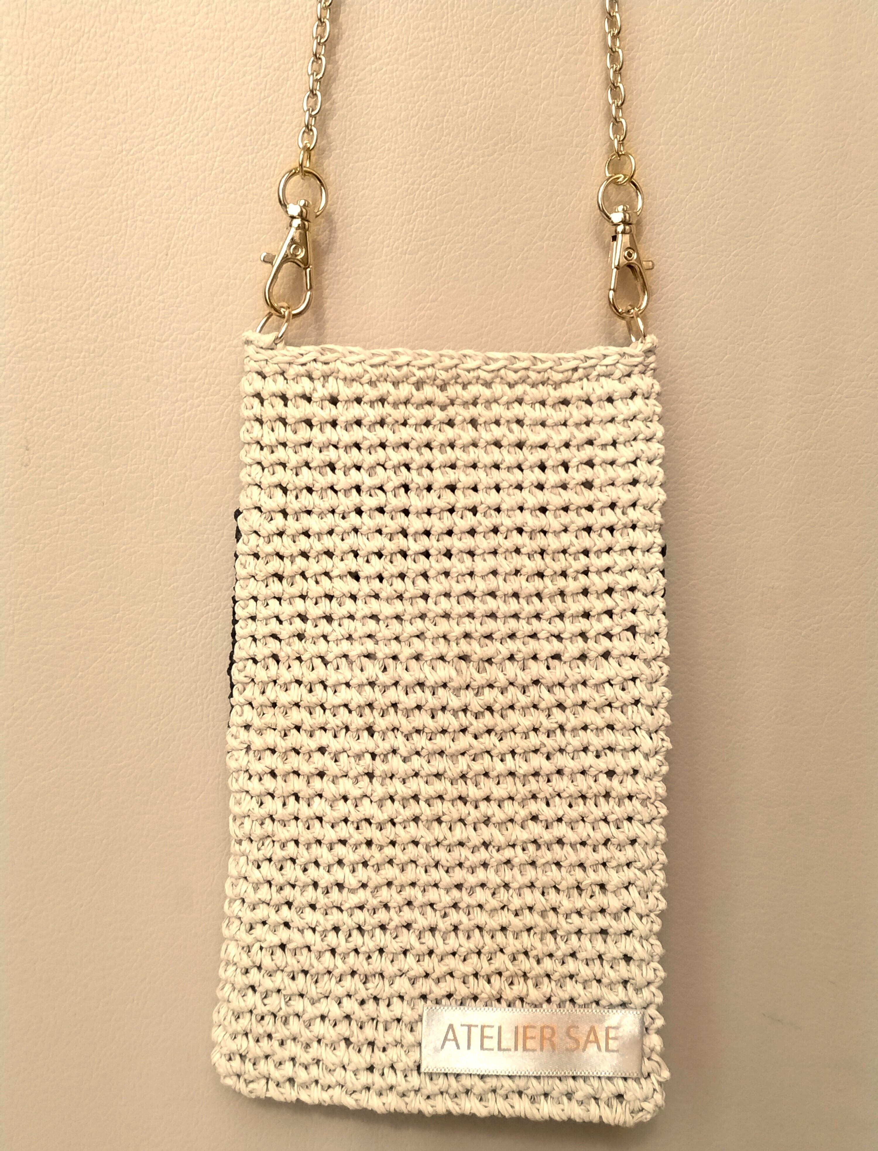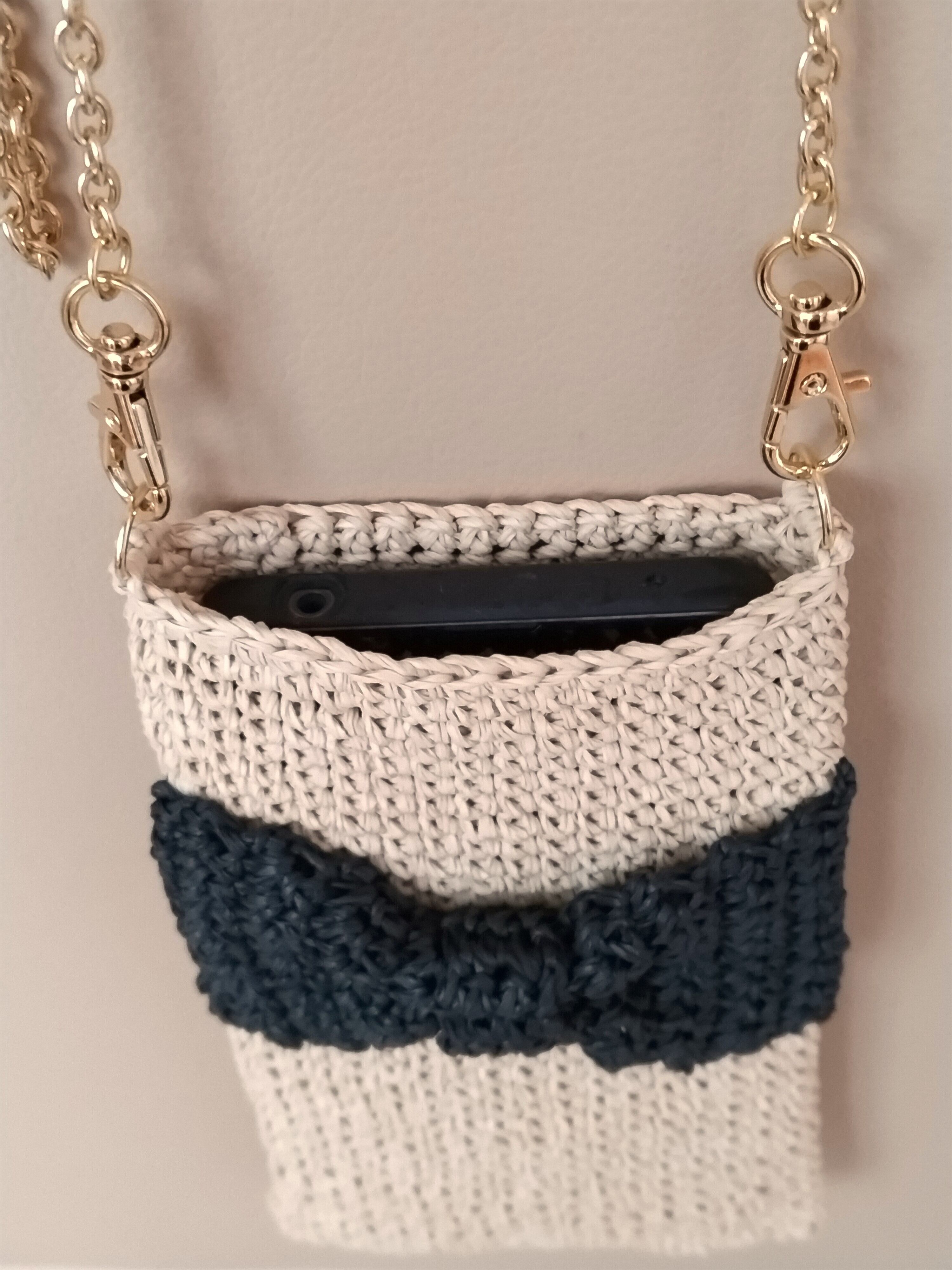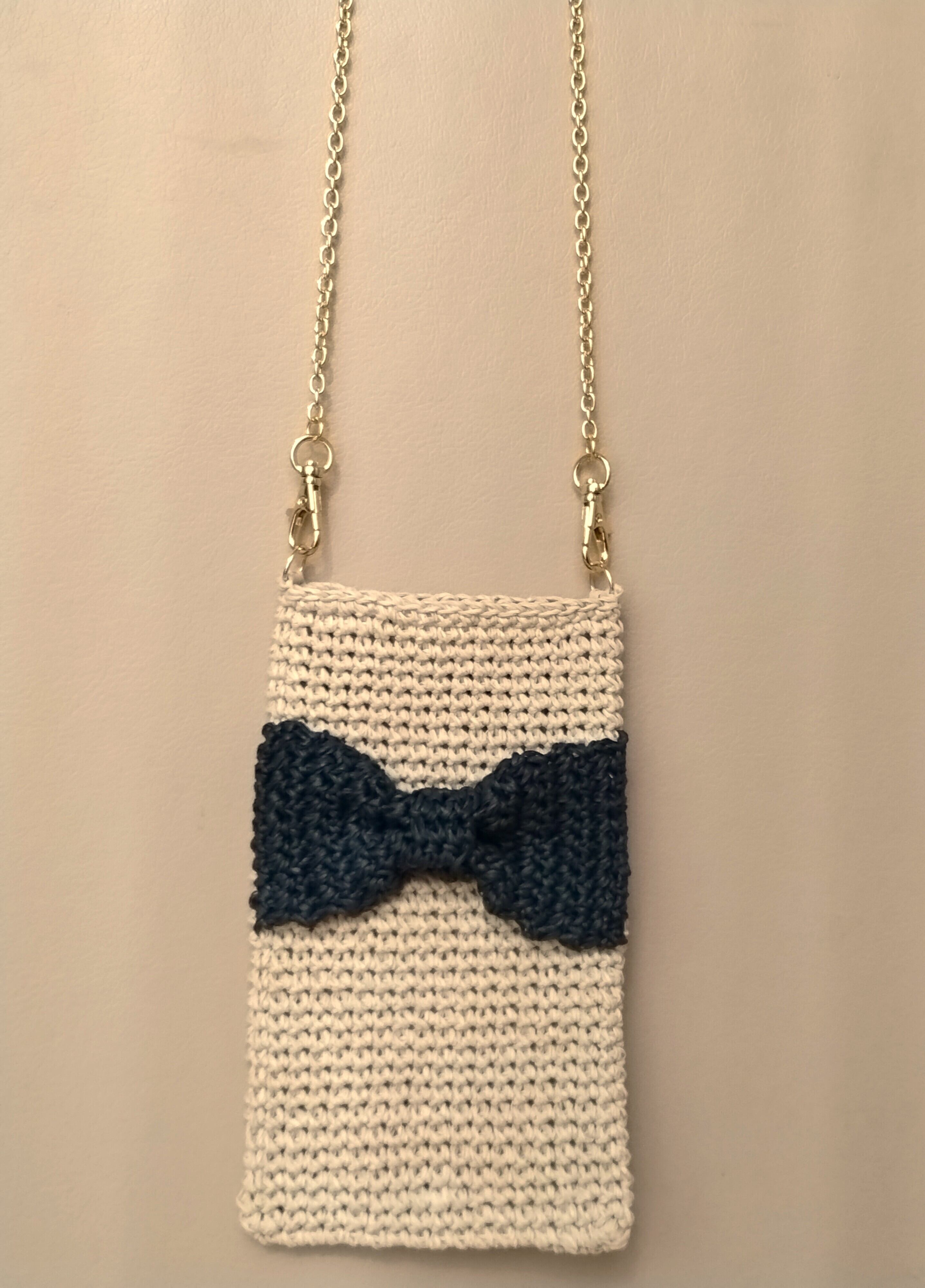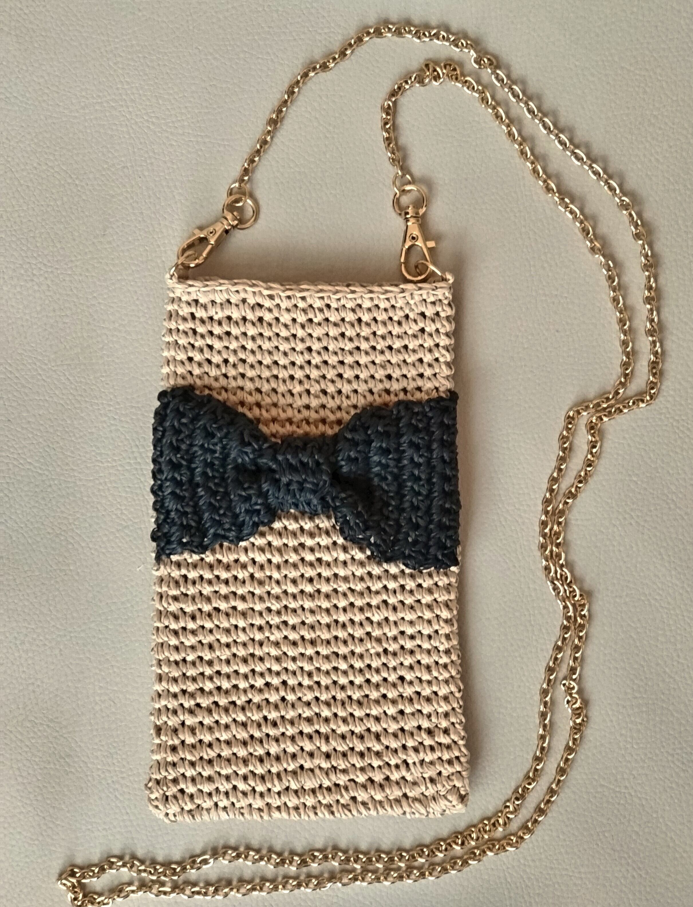 リボンがついたスマホポシェット。表はリボンでツートンカラー裏はナチュラルカラーの無地の2Way仕様です。